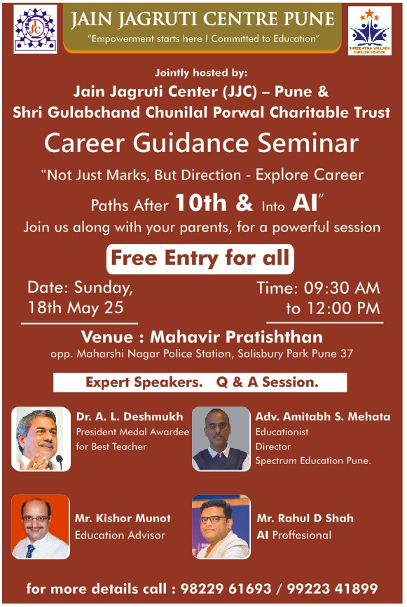 पुणे, जैन जागृति सेंटर (JJC), पुणे और श्री गुलाबचंद चुनीलाल पोरवाल चैरिटेबल ट्रस्ट के श्री आत्मवल्लभ इंग्लिश स्कूल, येरवडा के संयुक्त तत्वावधान में दसवीं कक्षा उत्तीर्ण छात्रों के लिए एक मुफ्त करियर मार्गदर्शन सत्र आयोजित किया गया है।