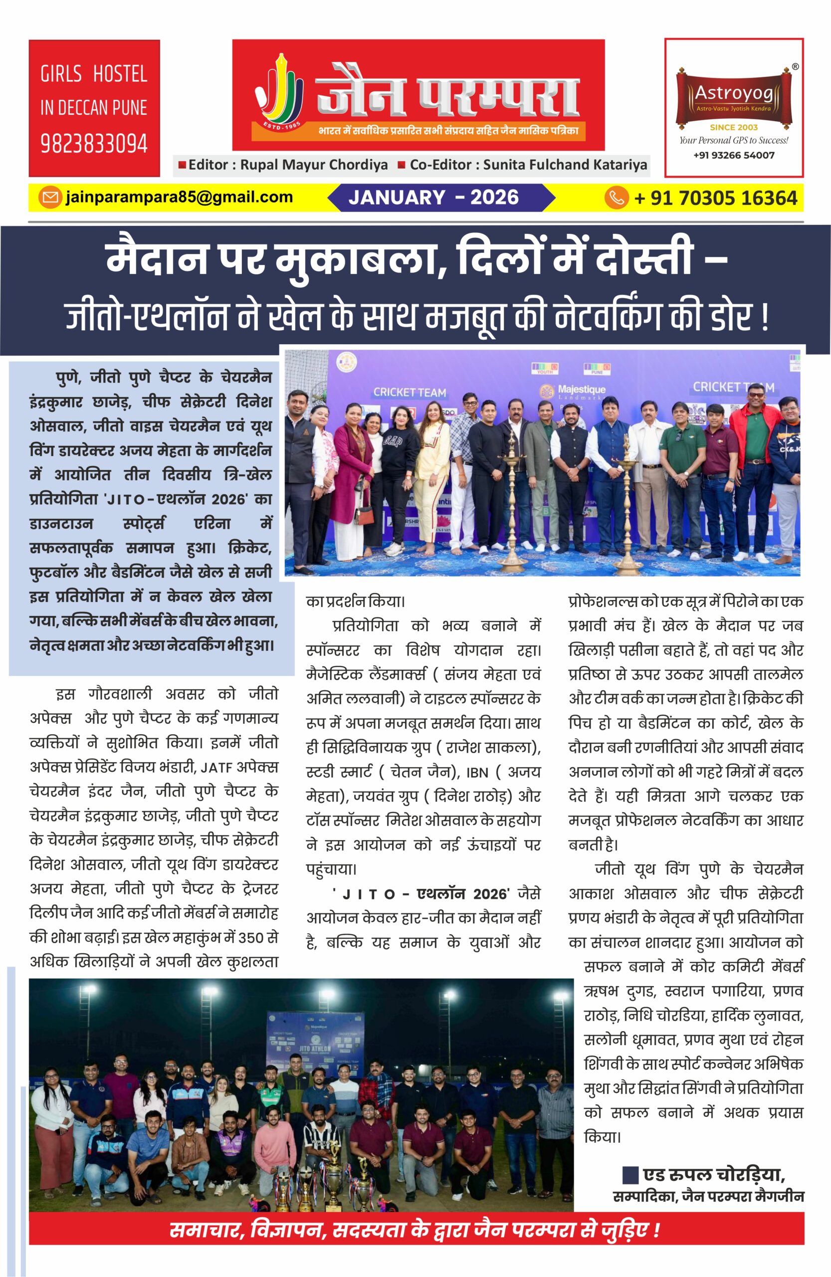 पुणे, जीतो पुणे चैप्टर के चेयरमैन इंद्रकुमार छाजेड़, चीफ सेक्रेटरी दिनेश ओसवाल, जीतो वाइस चेयरमैन एवं यूथ विंग डायरेक्टर अजय मेहता के मार्गदर्शन में आयोजित तीन दिवसीय त्रि-खेल प्रतियोगिता ‘JITO-एथलॉन 2026’ का डाउनटाउन स्पोर्ट्स एरिना में सफलतापूर्वक समापन हुआ। क्रिकेट, फुटबॉल और बैडमिंटन जैसे खेल से सजी इस प्रतियोगिता में न केवल खेल खेला गया, … Read more
