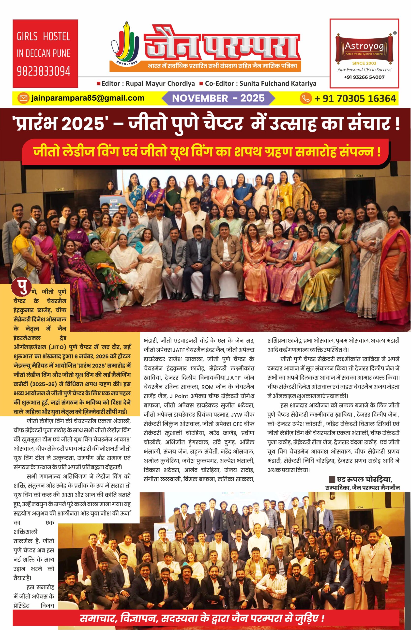 जीतो लेडीज विंग एवं जीतो यूथ विंग का शपथ ग्रहण समारोह संपन्न ! पुणे, जीतो पुणे चैप्टर के चेयरमैन इंद्रकुमार छाजेड़, चीफ सेक्रेटरी दिनेश ओसवाल के नेतृत्व में जैन इंटरनेशनल ट्रेड ऑर्गनाइजेशन (JITO) पुणे चैप्टर में ‘नए दौर, नई शुरुआत’ का शंखनाद हुआ। 6 नवंबर, 2025 को होटल जेडब्ल्यू मैरियट में आयोजित ‘प्रारंभ 2025’ समारोह … Read more