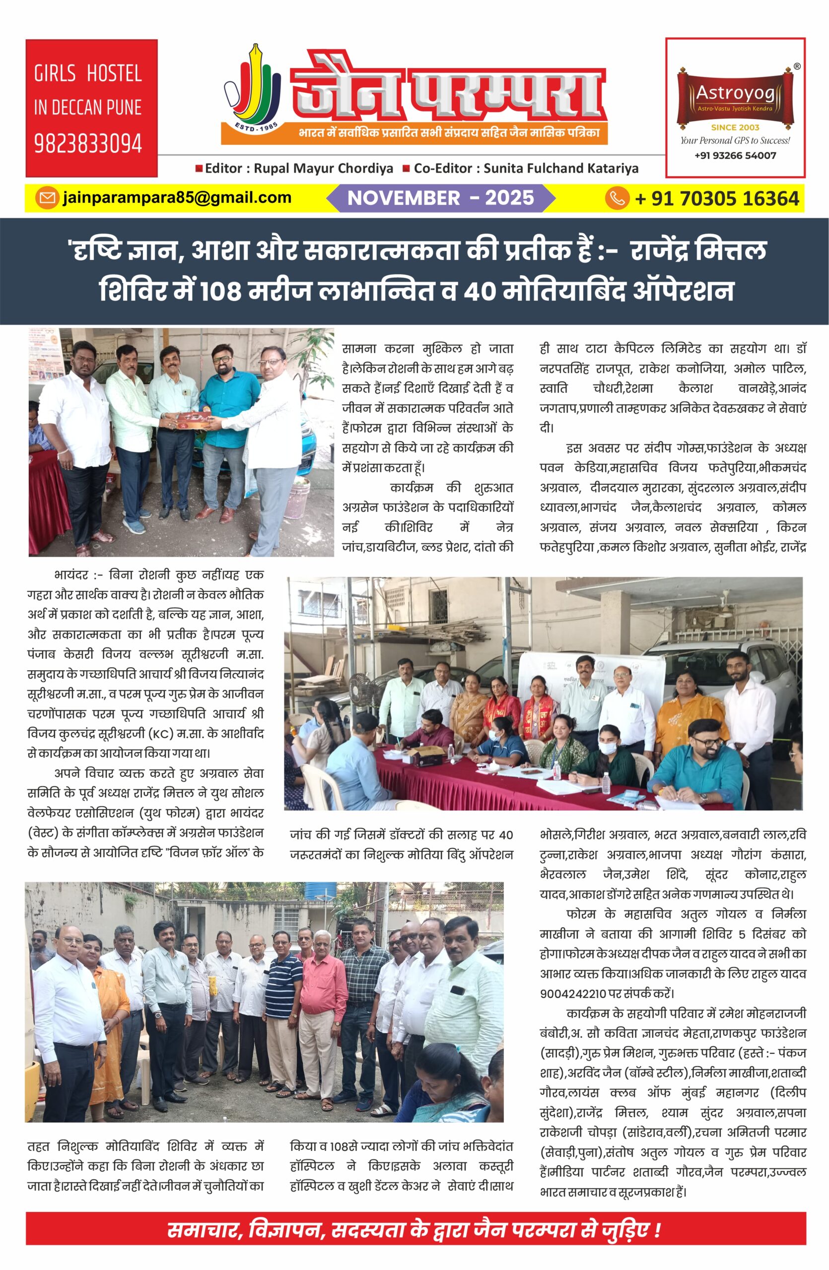 शिविर में 108 मरीज लाभान्वित व 40 मोतियाबिंद ऑपेरशन भायंदर :- बिना रोशनी कुछ नहीं।यह एक गहरा और सार्थक वाक्य है। रोशनी न केवल भौतिक अर्थ में प्रकाश को दर्शाती है, बल्कि यह ज्ञान, आशा, और सकारात्मकता का भी प्रतीक है।परम पूज्य पंजाब केसरी विजय वल्लभ सूरीश्वरजी म.सा. समुदाय के गच्छाधिपति आचार्य श्री विजय नित्यानंद … Read more