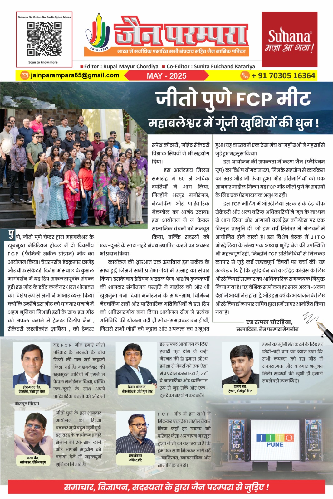 पुणे, जीतो पुणे चैप्टर द्वारा महाबलेश्वर के खूबसूरत मेरिडियन होटल में दो दिवसीय FCP (फैमिली सर्कल प्रोग्राम) मीट का आयोजन किया। चेयरपर्सन इंद्रकुमार छाजेड़ और चीफ सेक्रेटरी दिनेश ओसवाल के कुशल मार्गदर्शन में यह ट्रिप सफलतापूर्वक संपन्न हुई। इस मीट के इवेंट कन्वेनर भरत भोमावत का विशेष रूप से सभी ने आभार व्यक्त किया क्योंकि उन्होंने इस मीट को यादगार बनाने में अहम भूमिका निभाई। इसी के साथ इस मीट को सफल बनाने में ट्रेजरर दिलीप जैन , सेक्रेटरी लक्ष्मीकांत ख़ाबिया , को-ट्रेजरर रूपेश कोठारी , जॉइंट सेक्रेटरी विशाल सिंघवी ने भी सहयोग दिया।