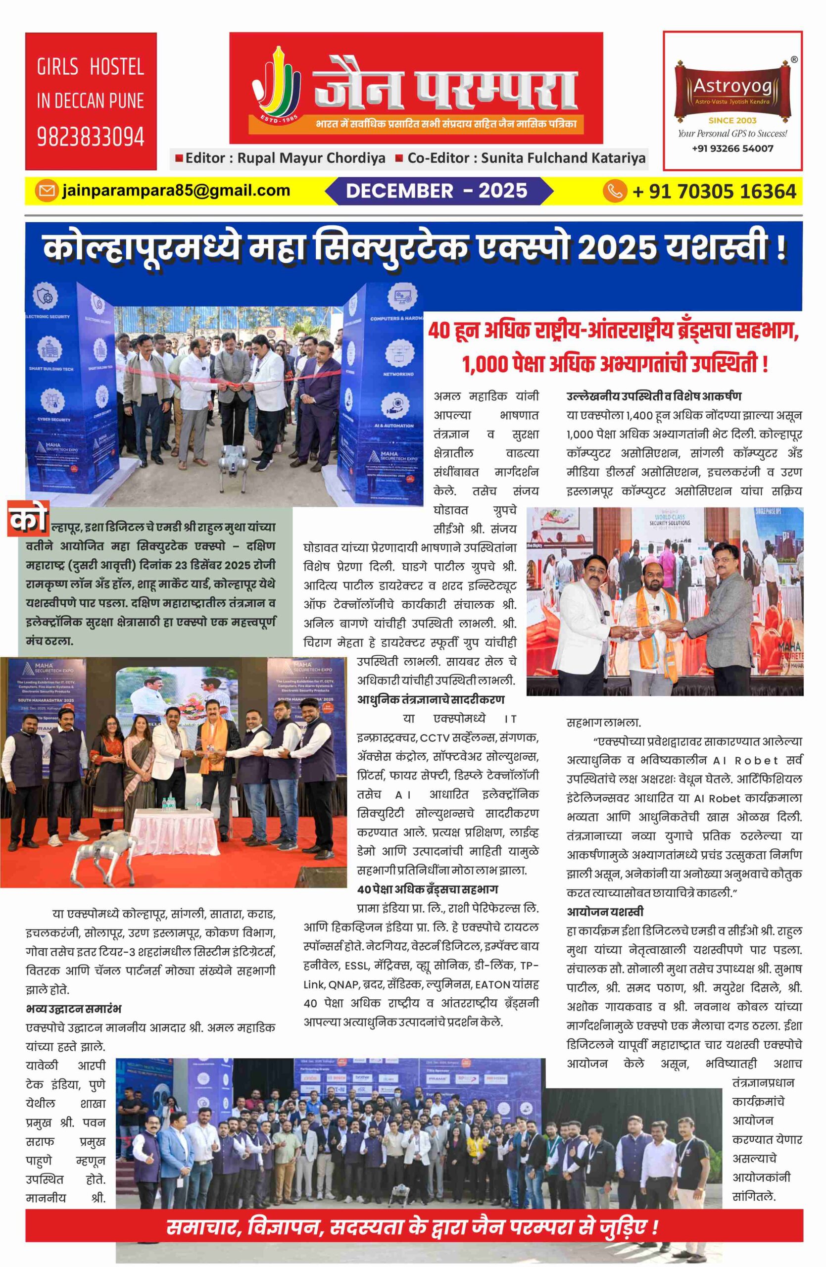 कोल्हापूर, इशा डिजिटल चे एमडी श्री राहुल मुथा यांच्या वतीने आयोजित महा सिक्युरटेक एक्स्पो – दक्षिण महाराष्ट्र (दुसरी आवृत्ती) दिनांक २३ डिसेंबर २०२५ रोजी रामकृष्ण लॉन अँड हॉल, शाहू मार्केट यार्ड, कोल्हापूर येथे यशस्वीपणे पार पडला. दक्षिण महाराष्ट्रातील तंत्रज्ञान व इलेक्ट्रॉनिक सुरक्षा क्षेत्रासाठी हा एक्स्पो एक महत्त्वपूर्ण मंच ठरला.