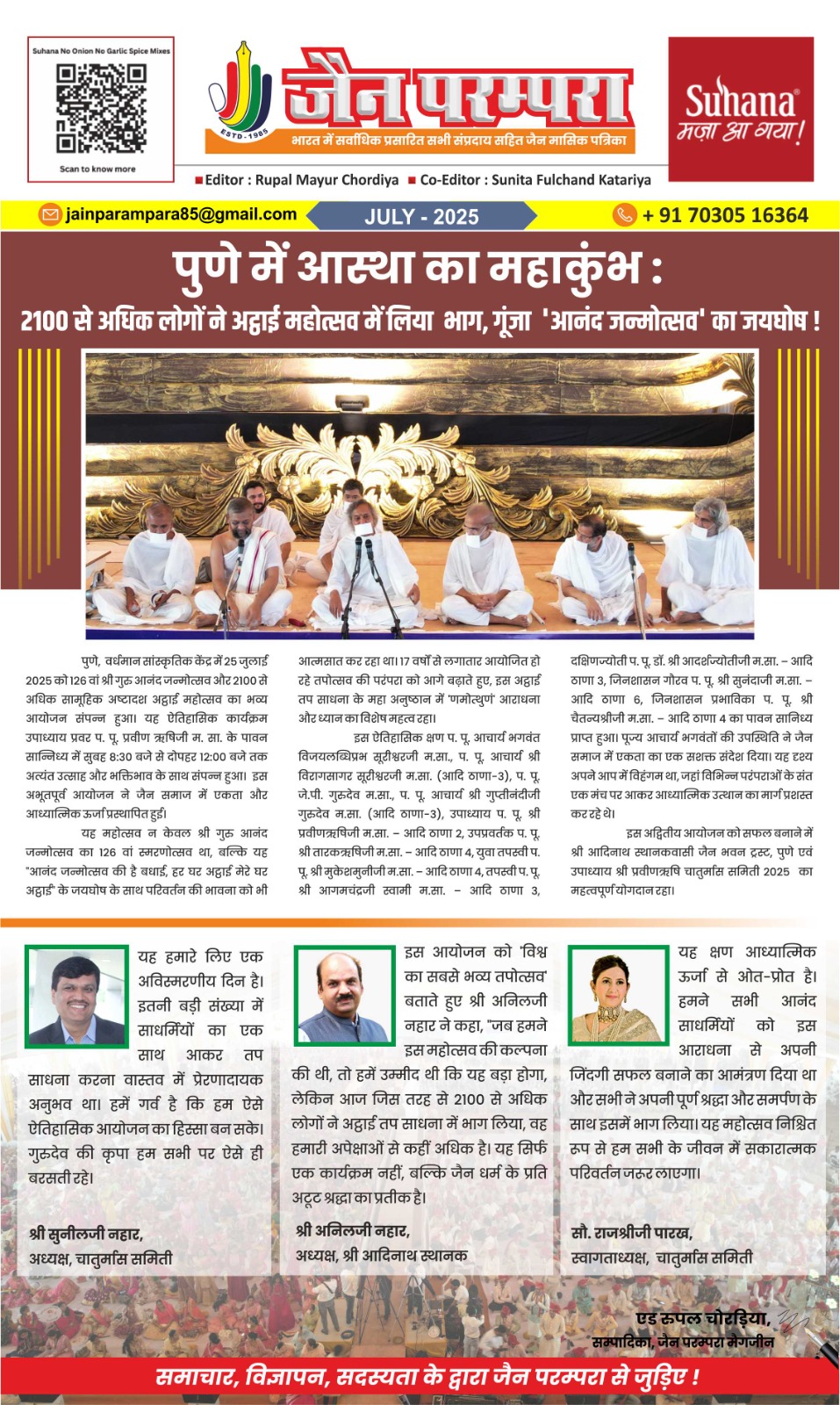 पुणे, वर्धमान सांस्कृतिक केंद्र में 25 जुलाई 2025 को 126 वां श्री गुरु आनंद जन्मोत्सव और 2100 से अधिक सामूहिक अष्टादश अट्ठाई महोत्सव का भव्य आयोजन संपन्न हुआ। यह ऐतिहासिक कार्यक्रम उपाध्याय प्रवर प. पू. प्रवीण ऋषिजी म. सा. के पावन सान्निध्य में सुबह 8:30 बजे से दोपहर 12:00 बजे तक अत्यंत उत्साह और भक्तिभाव के साथ संपन्न हुआ। इस अभूतपूर्व आयोजन ने जैन समाज में एकता और आध्यात्मिक ऊर्जा प्रस्थापित हुई।