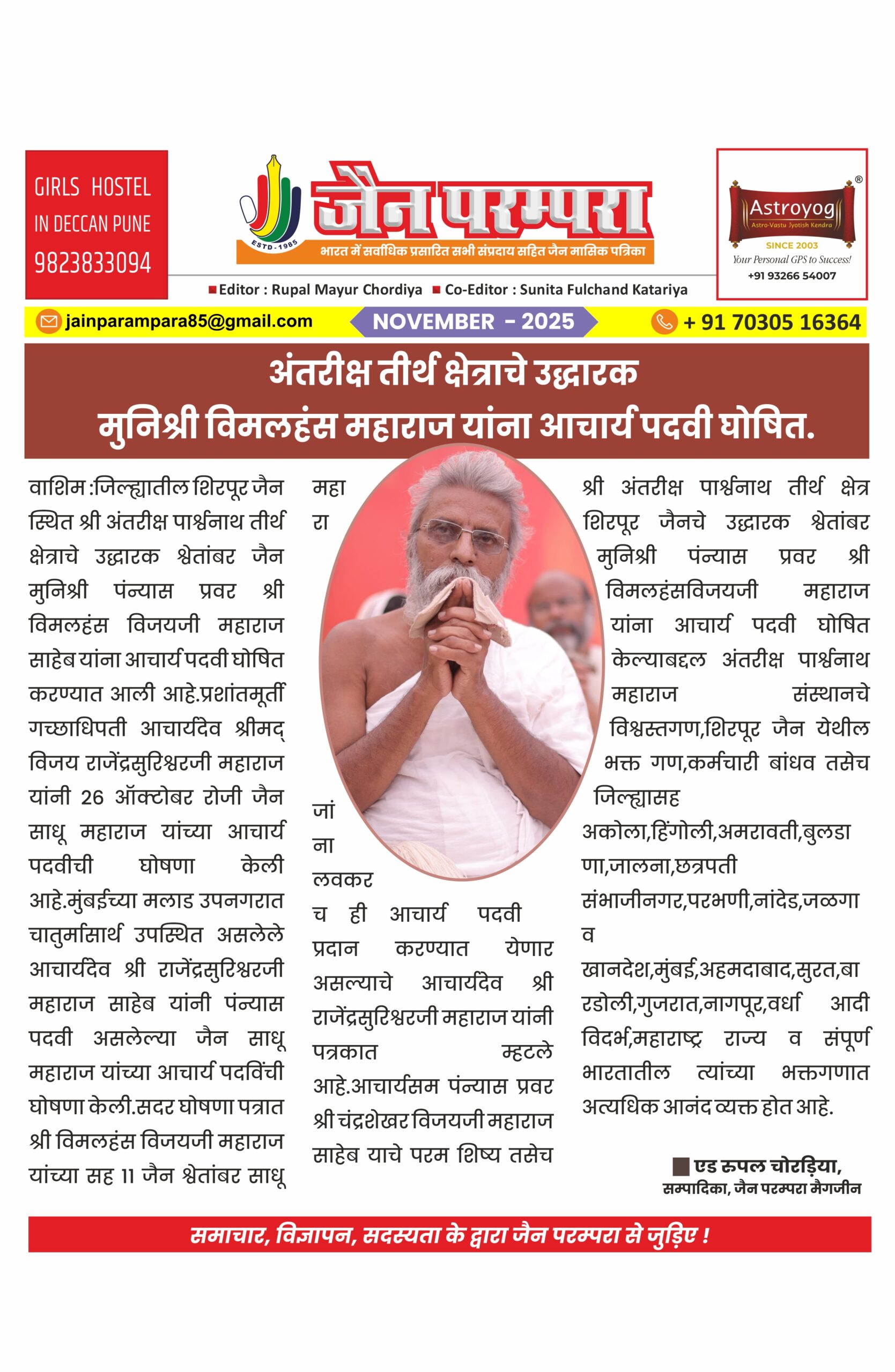 जिल्ह्यातील शिरपूर जैन स्थित श्री अंतरीक्ष पार्श्वनाथ तीर्थ क्षेत्राचे उद्धारक श्वेतांबर जैन मुनिश्री पंन्यास प्रवर श्री विमलहंस विजयजी महाराज साहेब यांना आचार्य पदवी घोषित करण्यात आली आहे.