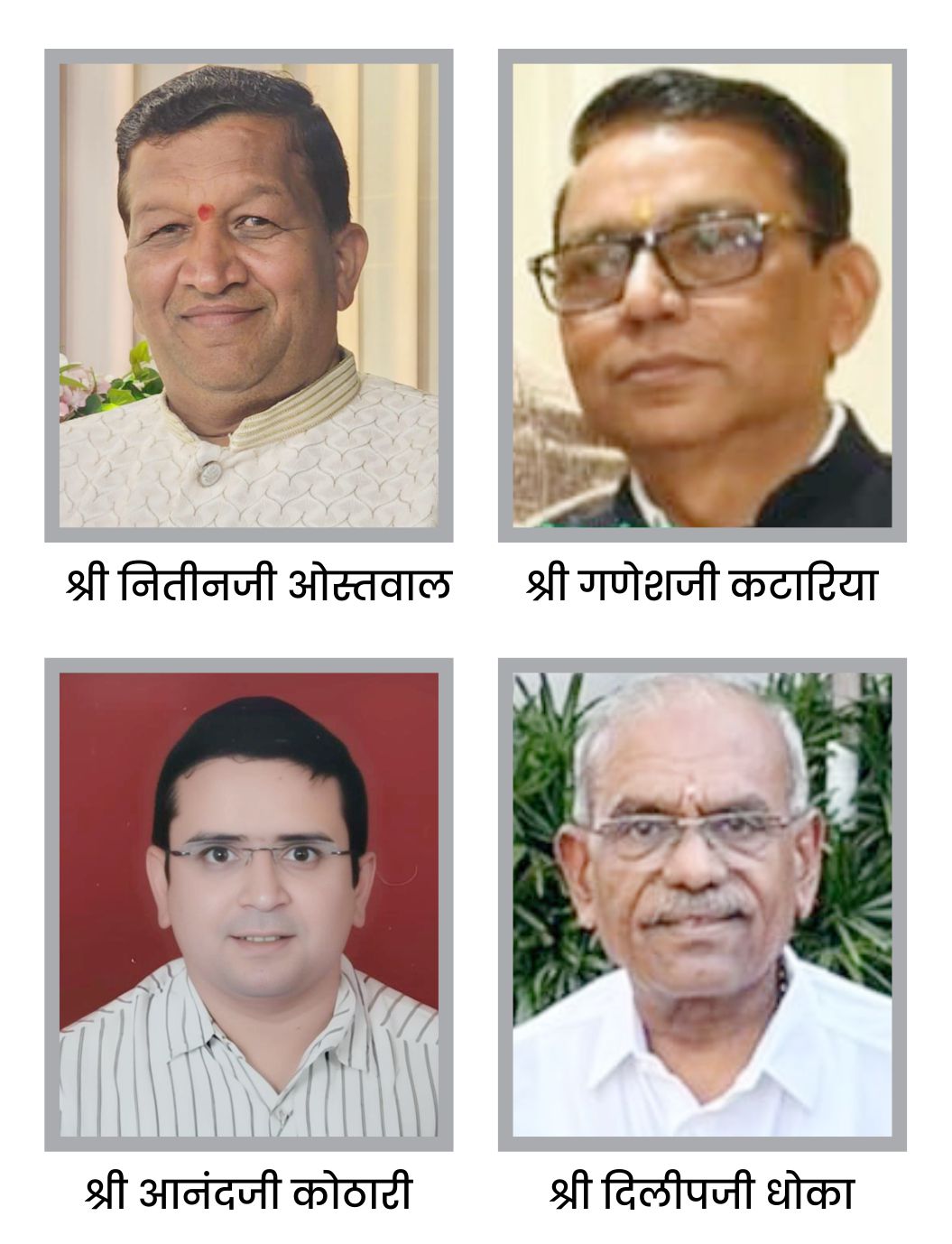 श्री नितीनजी ओस्तवाल ने श्री गणेशजी कटारिया को कार्यकारी अध्यक्ष, श्री आनंदजी कोठारी को सचिव और श्री दिलीपजी धोका को कोषाध्यक्ष नियुक्त किया है। ये सभी पदाधिकारी पिछले चार साल से संस्था के विभिन्न पदों पर काम कर रहे थे।