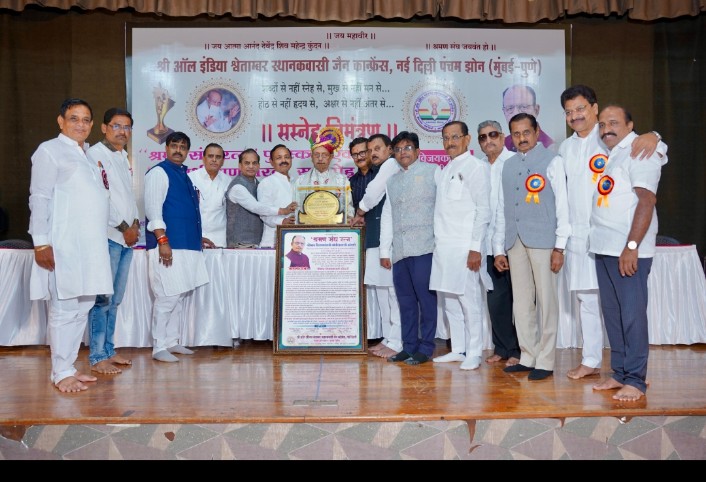 तसेच जाणता राजा श्री विजयकांत जी कोठारी यांना *श्रमण संघरत्न* ह्या उपाधिने प्रांतीय अध्यक्ष व पदाधिकारी आणि प्रमुख अतिथींच्या हस्ते सन्मानपत्र देऊन सन्मानित करण्यात आले. पंचम झोनचे अध्यक्ष श्री नितीनजी बेदमुथा यांच्या अध्यक्षतेखाली झालेल्या या कार्यक्रमांमध्ये जैन कॉन्फरन्सचे माजी अध्यक्ष अविनाशजी चोरडिया, पारसजी मोदी तसेच हर प्रांत जैन भवन समितीचे राष्ट्रीय अध्यक्ष डॉ अशोककुमार पगारिया, राष्ट्रीय उपाध्यक्ष कीर्ति दुगड , पुणे जिल्हा स्थानकवासी सकल जैन संघाचे संस्थापक अध्यक्ष श्री विजयकांत जी कोठारी, विद्यमान अध्यक्ष श्री पोपटलालजी ओस्तवाल ,कार्याध्यक्ष विलासजी राठोड, उपाध्यक्ष बाळासाहेब धोका तसेच जितो चे अपेक्स प्रेसिडेंट श्री विजय जी भंडारी, महावीर प्रतिष्ठानचे विश्वस्त ॲड अरुण जी शिंगवी , सिध्दाचलमचे अध्यक्ष मोहनलाल जी संचेती मंचावर उपस्थित होते.तसेच महावीर प्रतिष्ठानचे विश्वस्त श्रीपन्नालाल जी लुनावत , जैन कॉन्फरन्सच्या पूर्व महिला अध्यक्षा विमलताई बाफना , पिंपरी चिंचवड जैन महासंघाचे अध्यक्ष श्रेयस पगारिया, जैन कॉन्फरन्स अल्पसंख्याक समितीचे प्रांतीय अध्यक्ष गिरीष पारख, महिला उपाध्यक्षा प्रा सुरेखा ताई कटारिया, ज्ञानप्रकाश योजना प्रांतीय अध्यक्ष पी एम जैन , पुणे जिल्हा अध्यक्ष प्रा प्रकाश कटारिया आणि अनेक राष्ट्रीय कार्यकारिणी सदस्य अभय लुनावत, अशोक बाफना, विलास पगारिया , संदेश गदिया आदि मान्यवर उपस्थित होते.
