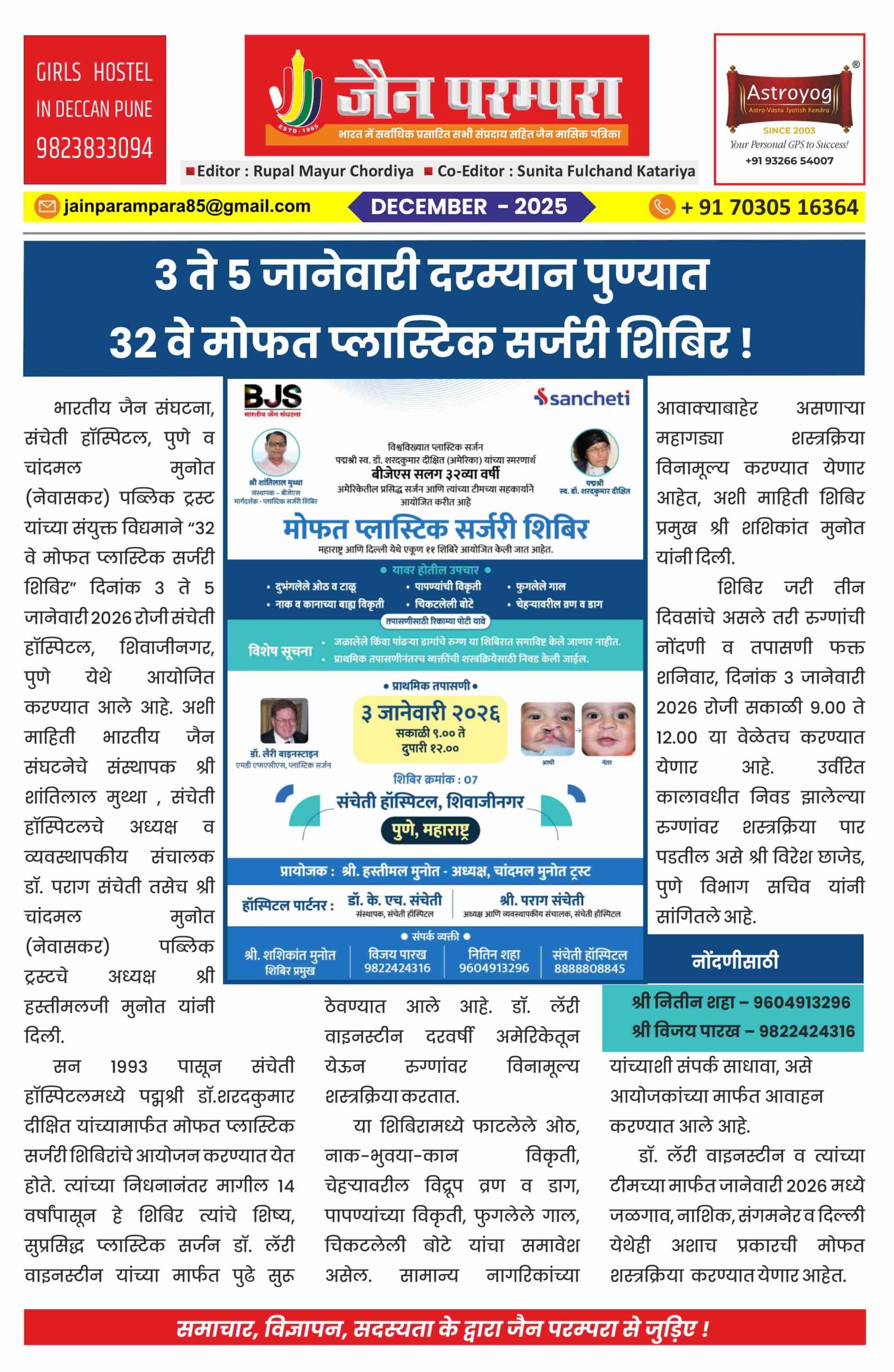 भारतीय जैन संघटना, संचेती हॉस्पिटल, पुणे व चांदमल मुनोत (नेवासकर) पब्लिक ट्रस्ट यांच्या संयुक्त विद्यमाने “३२ वे मोफत प्लास्टिक सर्जरी शिबिर” दिनांक ३ ते ५ जानेवारी २०२६ रोजी संचेती हॉस्पिटल, शिवाजीनगर, पुणे येथे आयोजित करण्यात आले आहे. अशी माहिती भारतीय जैन संघटनेचे संस्थापक श्री शांतिलाल मुथ्था , संचेती हॉस्पिटलचे अध्यक्ष व व्यवस्थापकीय संचालक डॉ. पराग संचेती तसेच श्री चांदमल मुनोत (नेवासकर) पब्लिक ट्रस्टचे अध्यक्ष श्री हस्तीमलजी मुनोत यांनी दिली.