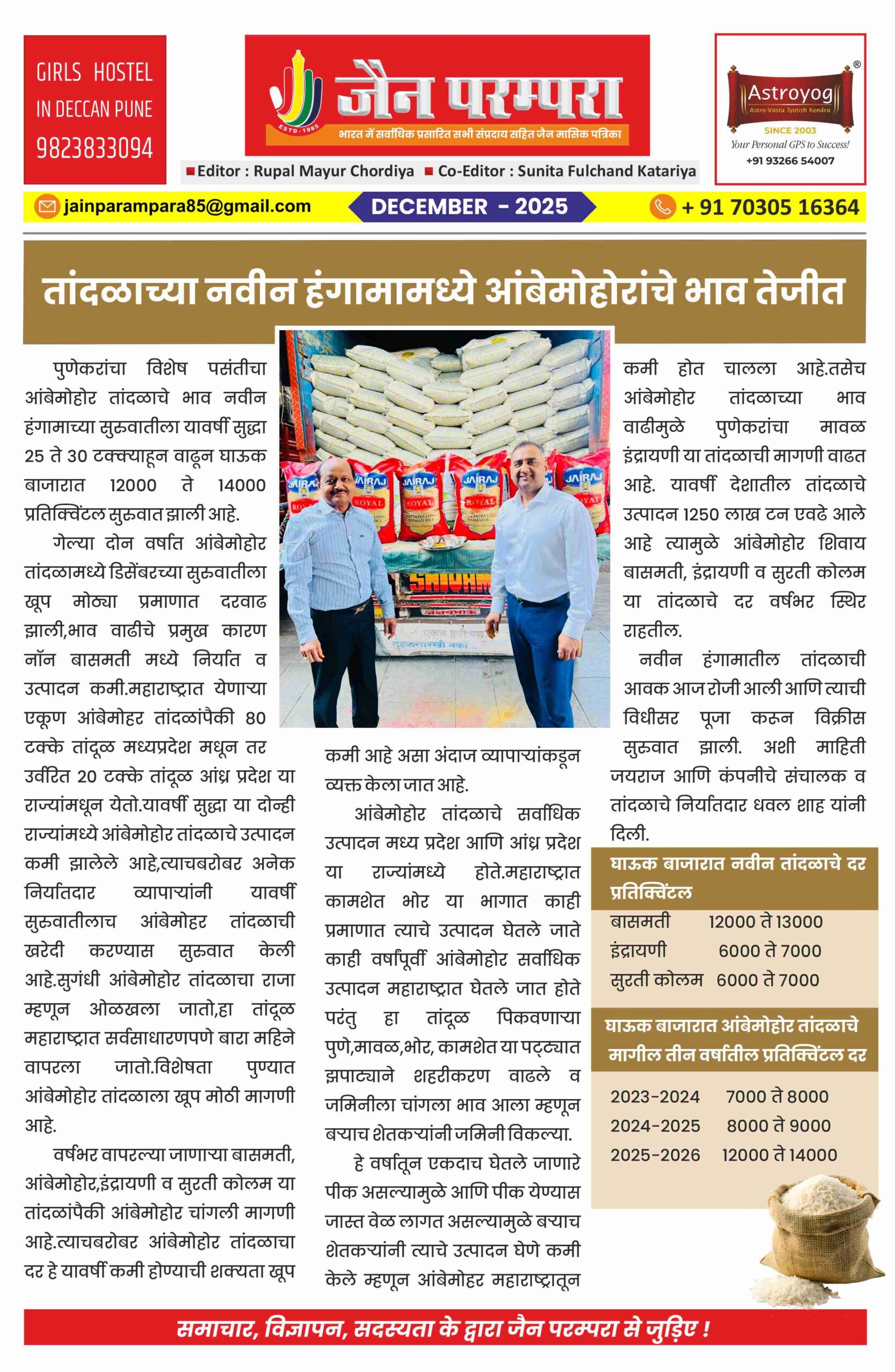 पुणेकरांचा विशेष पसंतीचा आंबेमोहोर तांदळाचे भाव नवीन हंगामाच्या सुरुवातीला यावर्षी सुद्धा 25 ते 30 टक्क्याहून वाढून घाऊक बाजारात 12000 ते 14000 प्रतिक्विंटल सुरुवात झाली आहे.गेल्या दोन वर्षात आंबेमोहोर तांदळामध्ये डिसेंबरच्या सुरुवातीला खूप मोठ्या प्रमाणात दरवाढ झाली,भाव वाढीचे प्रमुख कारण नॉन बासमती मध्ये निर्यात व उत्पादन कमी.