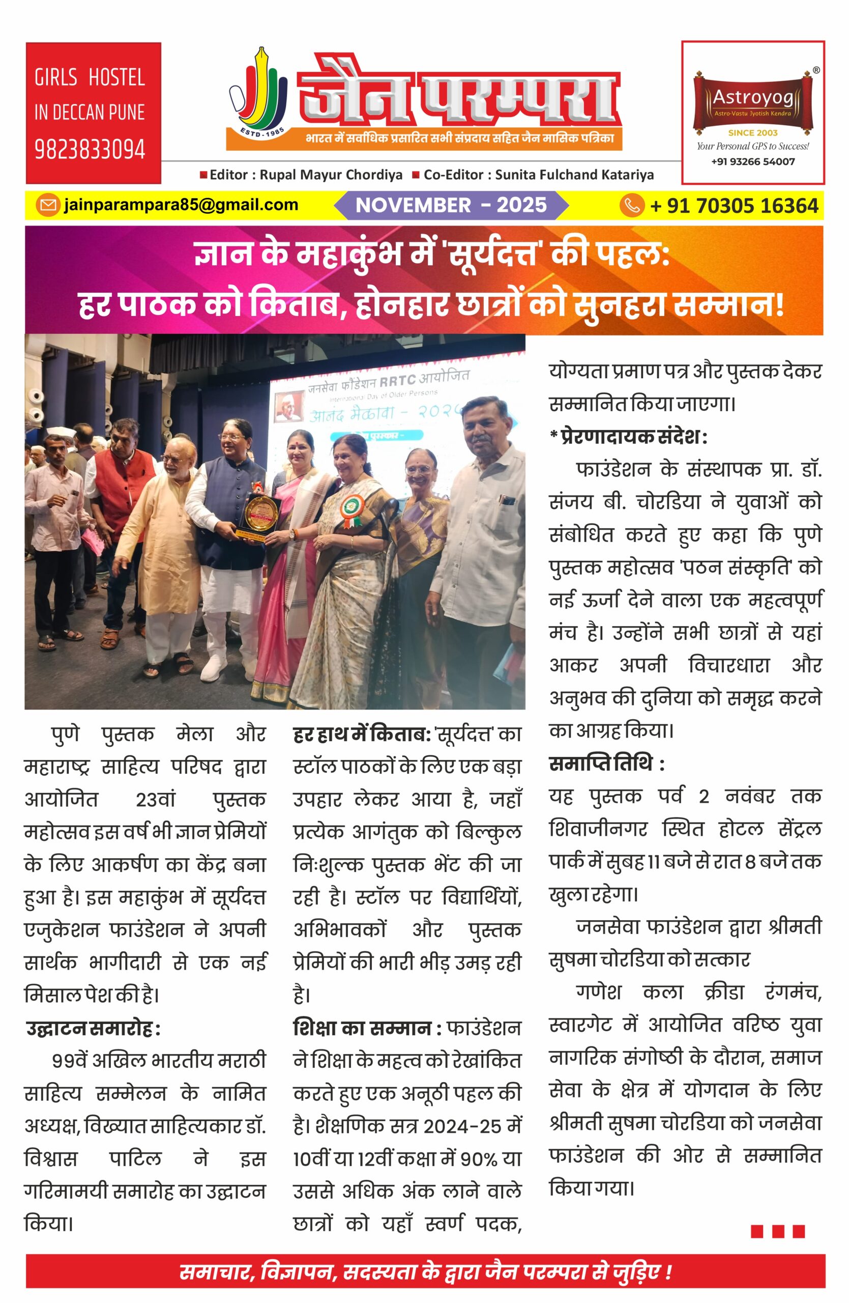 पुणे पुस्तक मेला और महाराष्ट्र साहित्य परिषद द्वारा आयोजित 23वां पुस्तक महोत्सव इस वर्ष भी ज्ञान प्रेमियों के लिए आकर्षण का केंद्र बना हुआ है। इस महाकुंभ में सूर्यदत्त एजुकेशन फाउंडेशन ने अपनी सार्थक भागीदारी से एक नई मिसाल पेश की है।